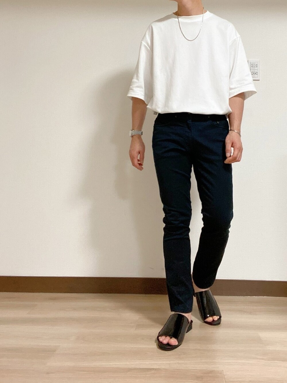 【タックインコーデ】 タックインのモノトーンコーデ。 エナメル加工されているレザーサンダルなのでとても大人っぽい仕上がりに。 履き心地は抜群です。