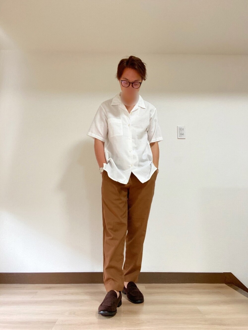 【シャツコーデ】 オープンカラーにブラウンのボトムス合わせ。 足長効果でローファーもブラウンにしました👞