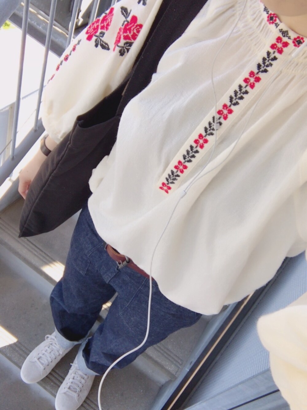 暖かくなってきたので ブラウス1枚に 前に買って雨降ったりで なかなか履けてなかったStan Smith