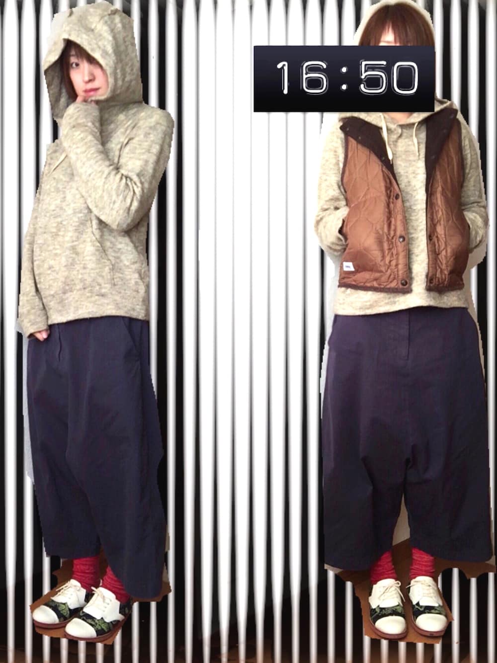 パーカーのフードをベストから出したり フード付きのベストだったり そーゆーのとても好きで小学校の頃からハマってました♡ このフードには耳がついていて、遊び心のあるデザインが魅力のmercibeaucoup,が大好きです♪ シンプルに着ても、楽しい♡ もっとごちゃごちゃするのも楽しい♡ ARMENのキルティングリバーシブルベストは久しぶりに着たけど、あの頃ARMENにハマってたなぁ〜 さー 明日まで仕事! もうひと踏ん張り!