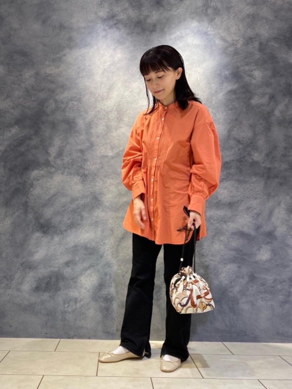 身長:152cm 普段サイズ:トップス36/ボトム36/シューズ22.5cm 【サイズ感】 トップス:ゆったりめ ボトム:36で裾がやや長めですが、お直しなしでも丁度良い長さです。ウエストはトップスをインしても余裕があります。 シューズ:標準的 【コーディネートポイント】 ブラックデニムをオレンジのブラウスで女性らしいスタイリングにしてみました。ふわっとした程良いボリュームとヒップが隠れる着丈のブラウスもすっきり見えします。 小物も白でまとめて、大人っぽく仕上げました。
