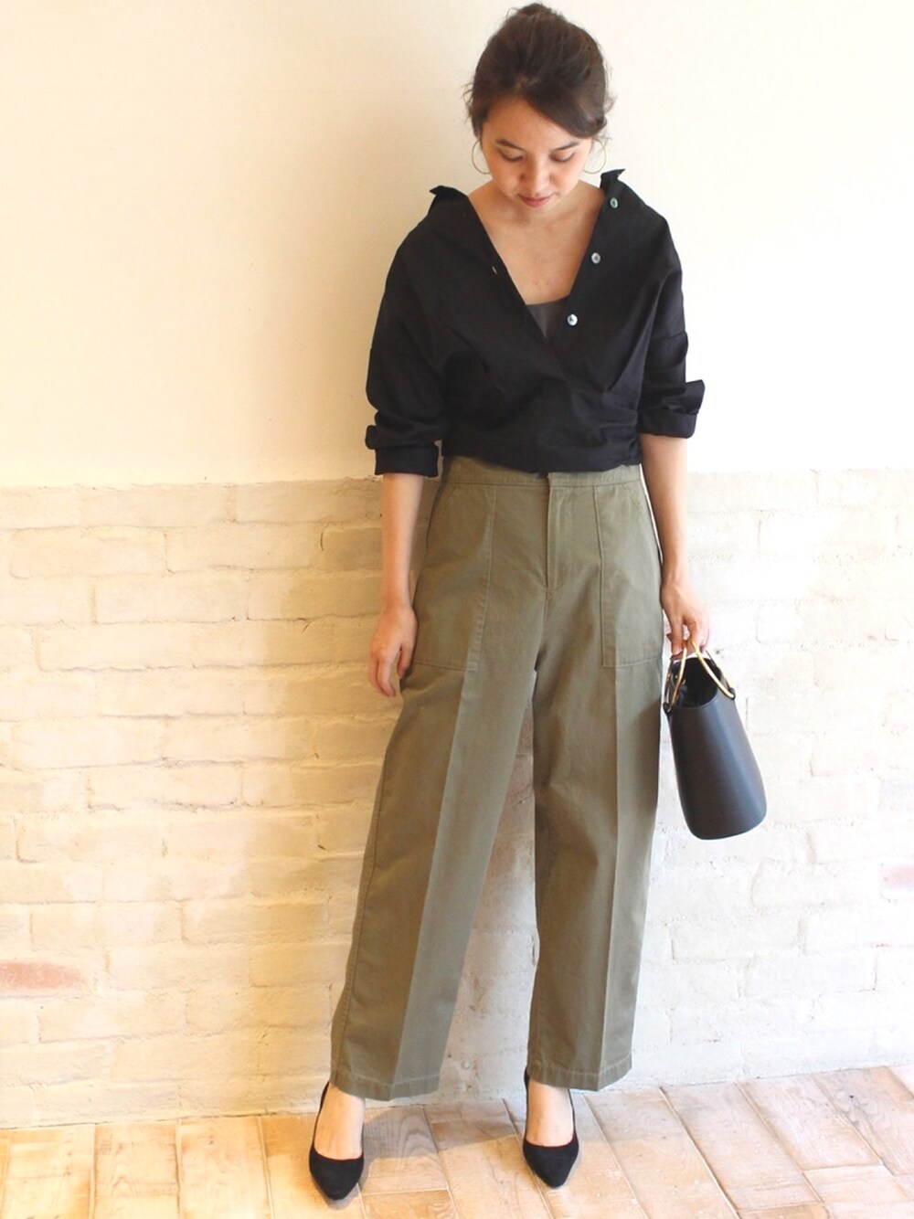 たくさんこだわりの詰まったデザインシャツ! わたしはあえて全部ボタンをあけて、ラフな感じにしました😌 金子綾さんコラボのベイカーパンツは、38サイズを履いて少しゆったり履いています。