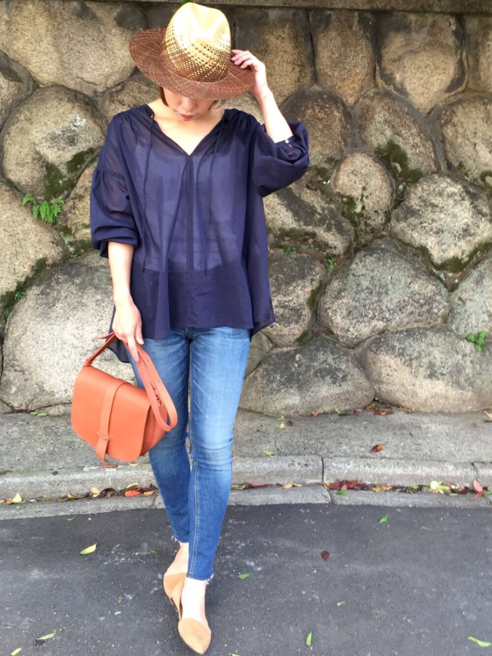 デニムとの相性の良い さらっと着られる透け感のあるブラウスふんわりと風をはらむ柔らかなディテール 夏に向けて、お気に入りのデニムと、夏らしい雑材の小物と合わせていかがですか?