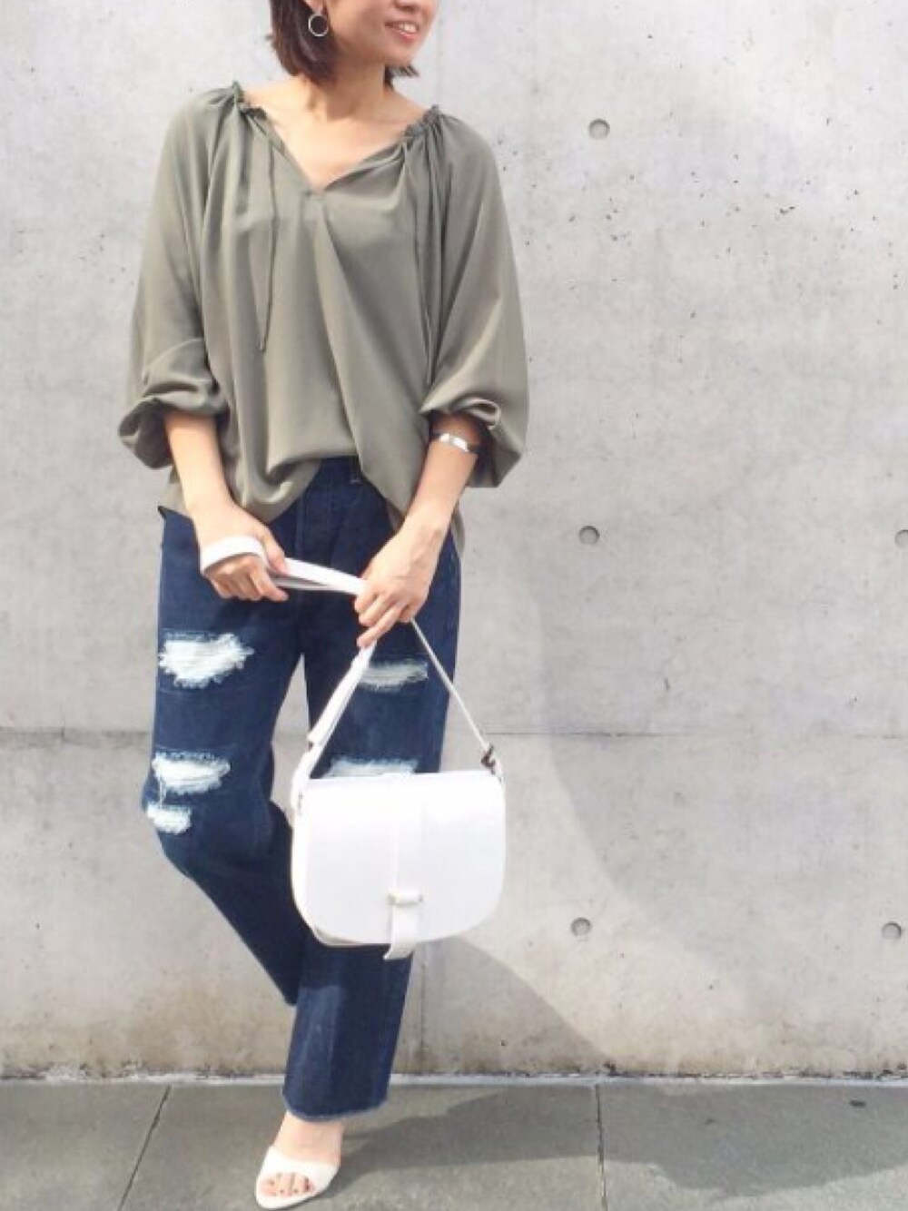 今年外せない70s。 チュニック丈のギャザーブラウスが雰囲気を作るコーディネート。 リメイクデニムにカーキのブラウスをチョイスしたことでカジュアルさとアンニュイさ、綺麗さが程よくミックスされたコーディネートに。 ゆったり流れる生地感が女性らしく、少しのトレンド感が加えられます。