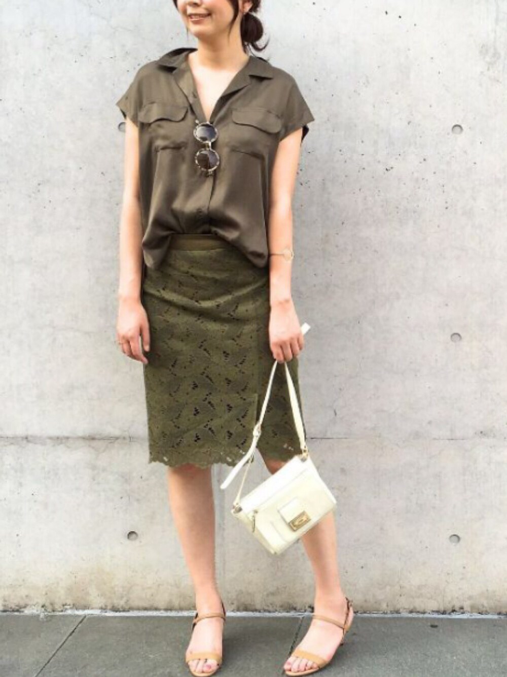 《とろみ×レース》リッチ素材でつくるセットアップ タイムレスに着られる上質なシャツにタイトスカートを合わせて。 ベーシックなアイテムを今年見えさせる秘訣はセットアップ風の着こなし。 とろみ素材と繊細なレース、リッチ感ある素材はそれだけでエレガントな印象に。 シャツ×タイトスカートのぴりりとした装いに女性らしさが加わった好バランスなスタイリングです。