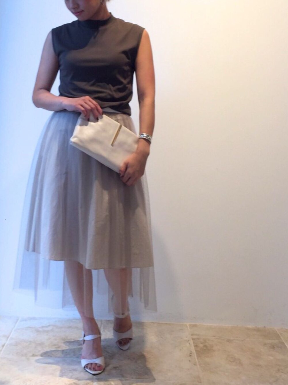 チュールスカートは ノースリーブやサンダルで合わせても、カラーをシックにすれば暑い時期から楽しめる晩夏スタイルに。