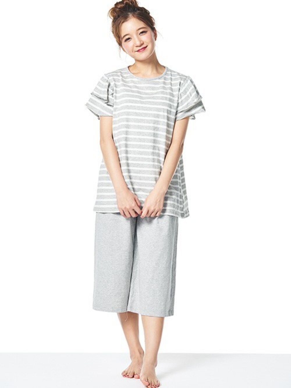 夏にヘビロテ間違いなしのコットン100%のルーム&スリープウェア。 袖がフリルになったフェミニンなトップスと楽ちんなガウチョパンツのセット。 パンツが無地になっているのでパジャマ過ぎないデザインと、 パジャマにもなる着心地が嬉しいアイテムです。 Border cotton 袖フリル・セットアップ(Gray)fp207w182d 4,900yen(+ tax)