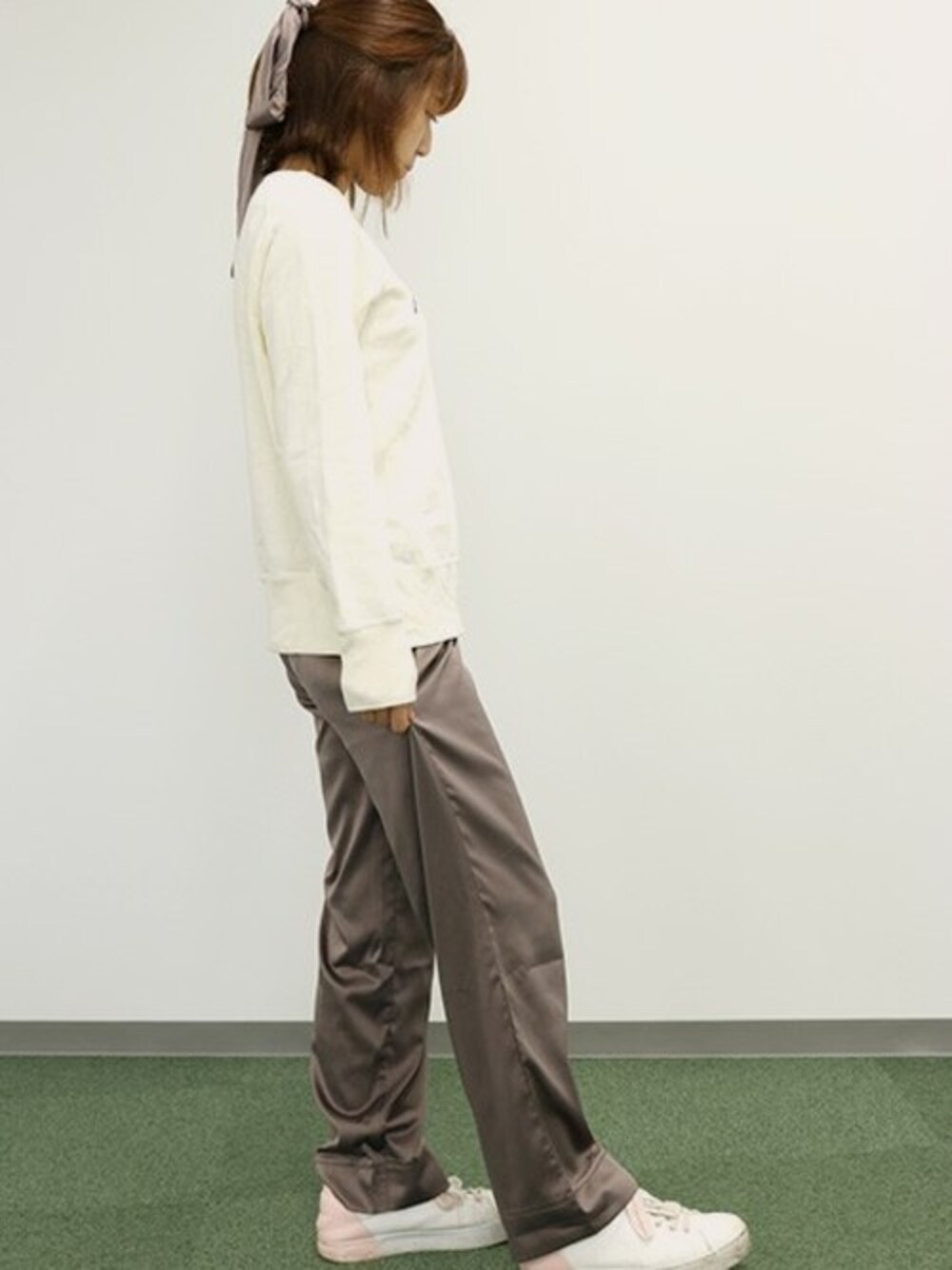 シルクと間違えるほどの滑らかなとろみが心地良い fran de lingerieのサテンパジャマをタウンユースしてみました。 ニュアンスのあるブラウンのサテンパンツに オフホワイトのロゴスエットと合わせて、 リラックス感たっぷりのカジュアルスタイルの完成。 同じ生地を使ったボリューム袖&ガウチョパンツtypeについてくるベルトリボンを髪に結んで、 フェミニンさも+。 milky saten シャツパジャマ 上下セット(Brown)mst101c 2,900yen(+ tax) milky saten ボリューム袖&ガウチョパンツパジャマ 上下セット(Brown)mst111c 2,900yen(+ tax)