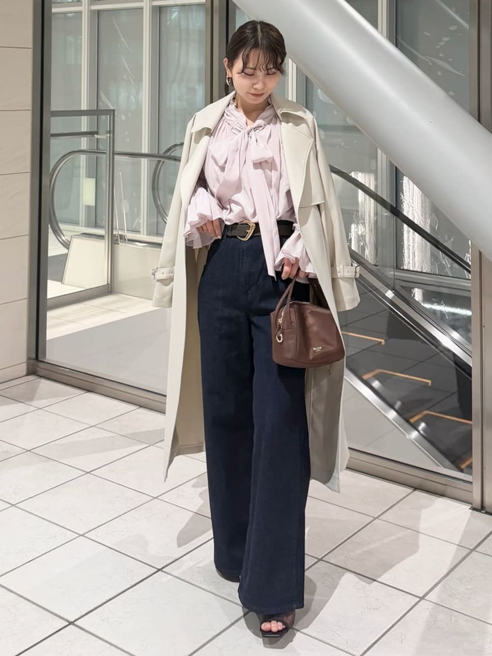 シワになりにくく、シルエットも綺麗なトレンチコート🧥 撥水加工も施してあり機能性も◎ ブラウスは前後2wayのアイテムなので コーディネートによって表情を変えられます♡ デニムはLeeとFRAY I.Dのコラボアイテムです👖 身長:159cm 店舗名:名古屋ラシック店