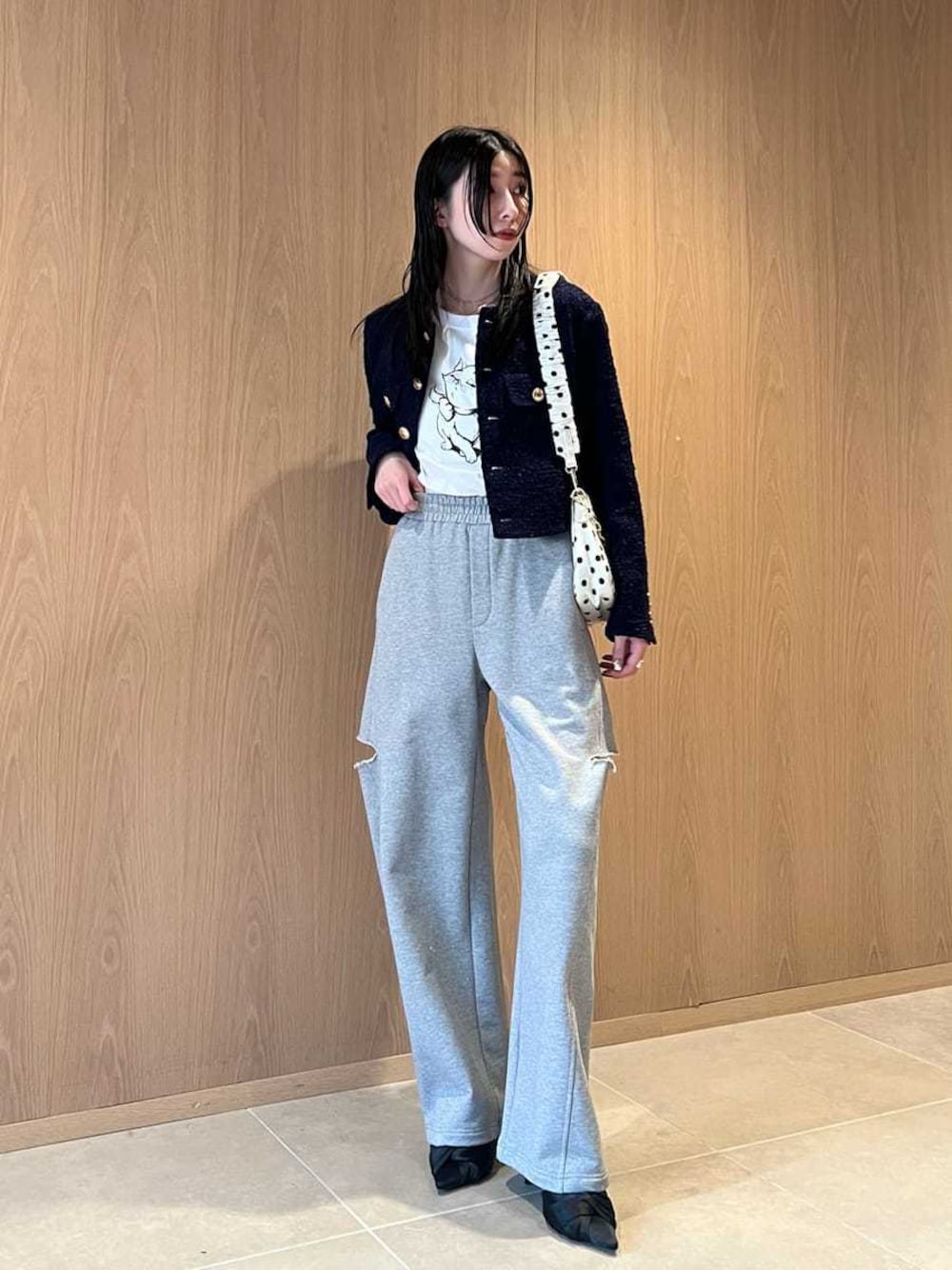 『おしゃれキャット』コラボアイテム🎀 Tシャツ×スウェット合わせですが ツイードジャケットとポインテッドトゥシューズで 女性らしいコーディネートに仕上げました! 身長:161cm 店舗名:表参道ヒルズ店