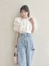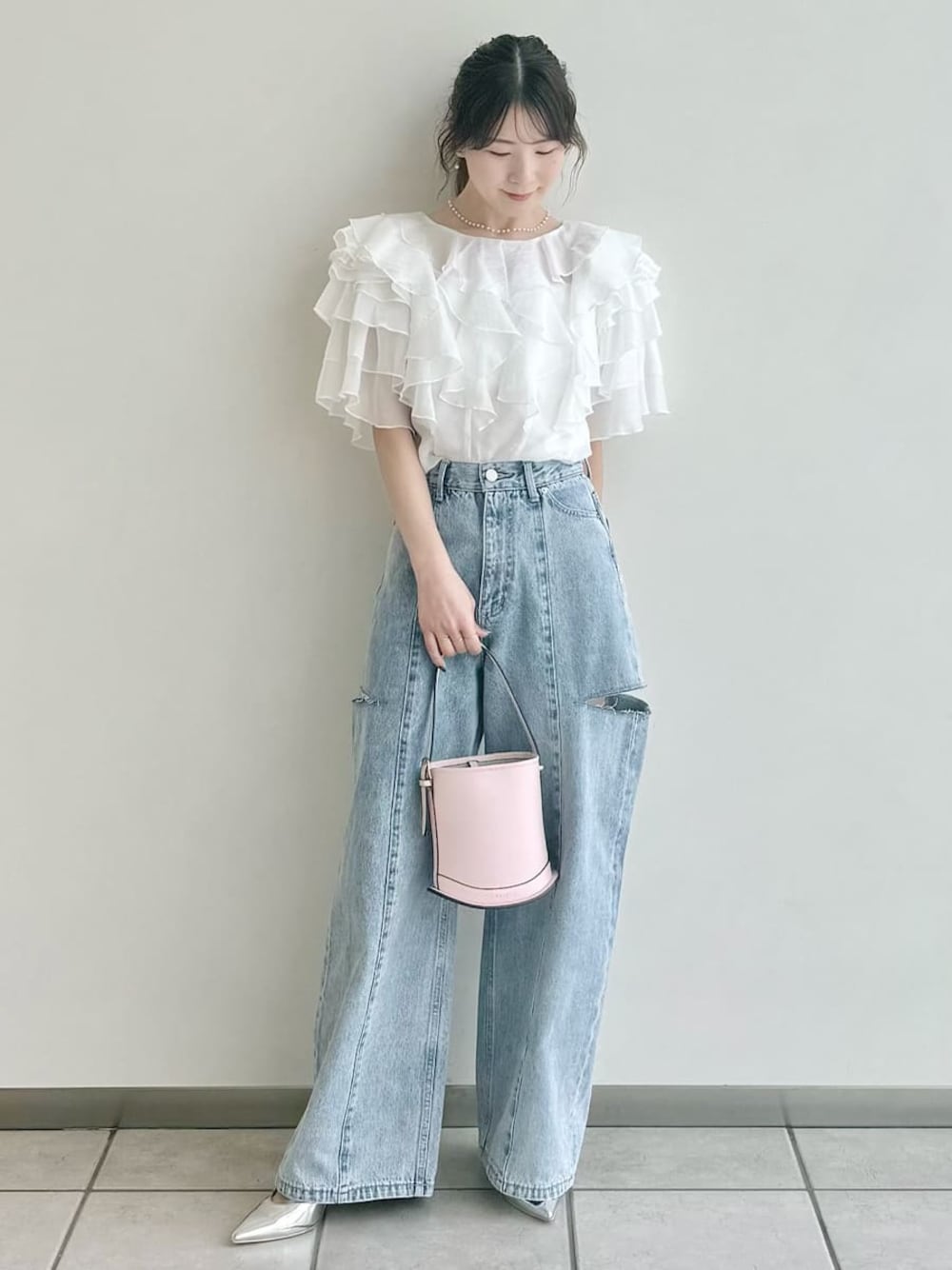 フリルたっぷりのブラウスとバレルシルエットが可愛いデニム✨ デニムのカットアウトは抜け感もありポイントです^^♡ トレンチと合わせて春コーデを先取りできます✨ 身長:158cm 店舗名:名古屋ラシック店