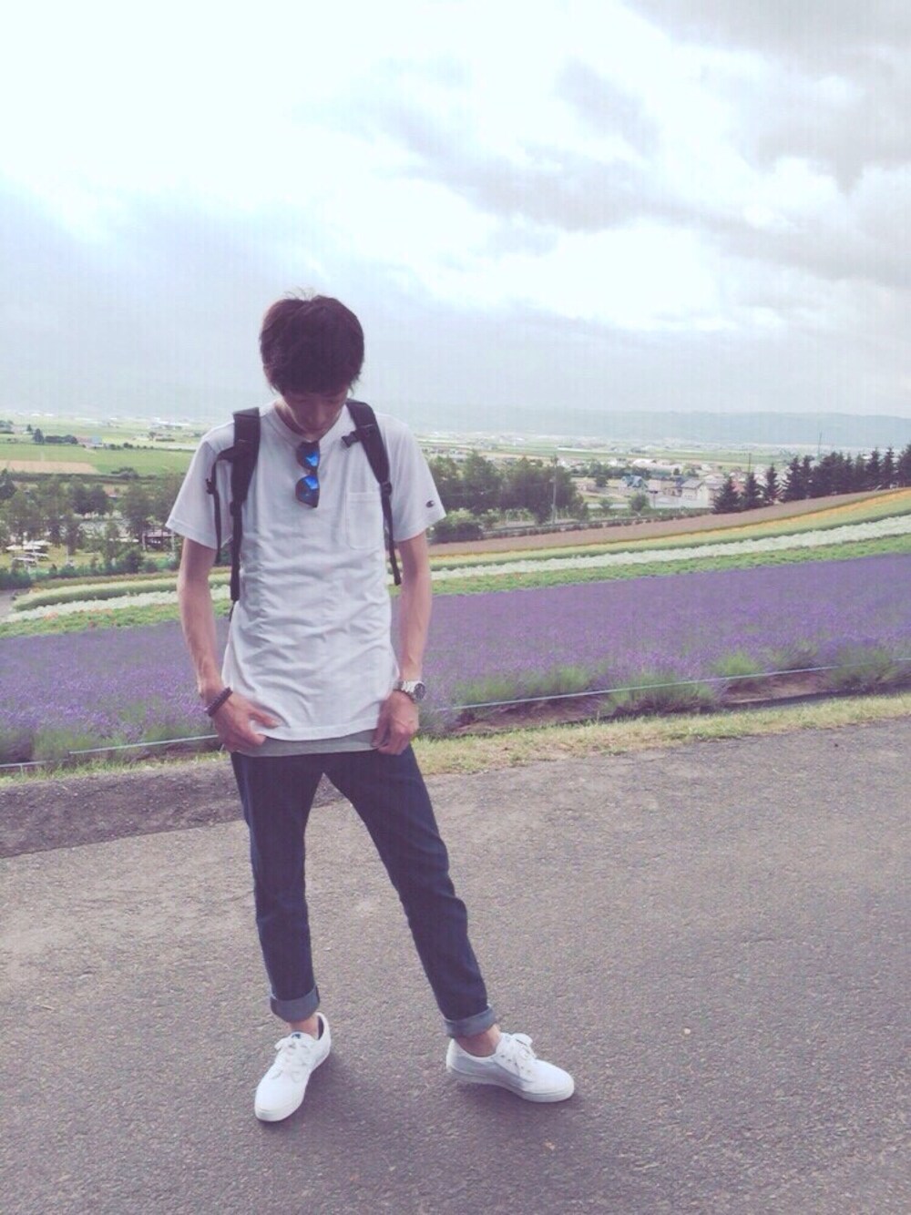 久しぶりの更新!! 富良野ラベンダーをバックにパシャり! お気に入りのチャンピオン白Tにロング丈タンクトップ! またたまに更新していくのでフォロー、saveお願いします