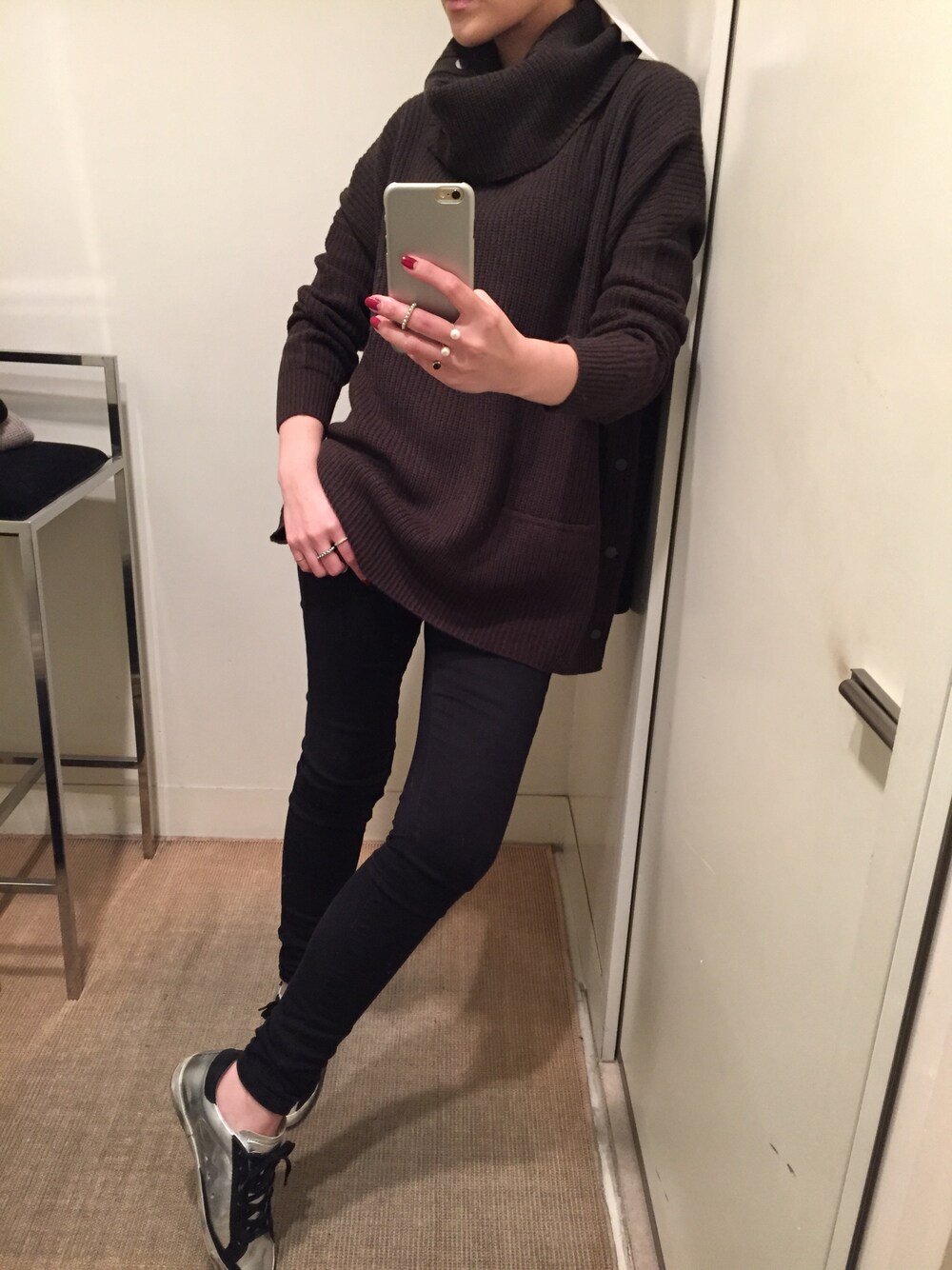 ブラウン系のニット/セーターを着用したレディースの秋コーディネートの1枚目の写真
