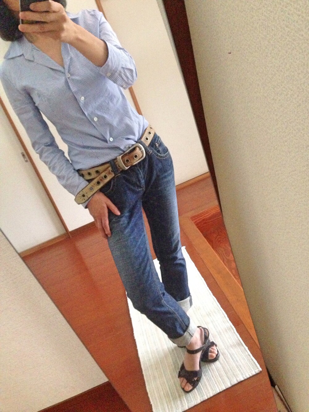 お気に入りのゴツいベルト♪ きれいめデニムなら、オフィスでもいけるかな。 シャツ LE SOUK デニム URBAN RESERCH サンダル ブランド不明