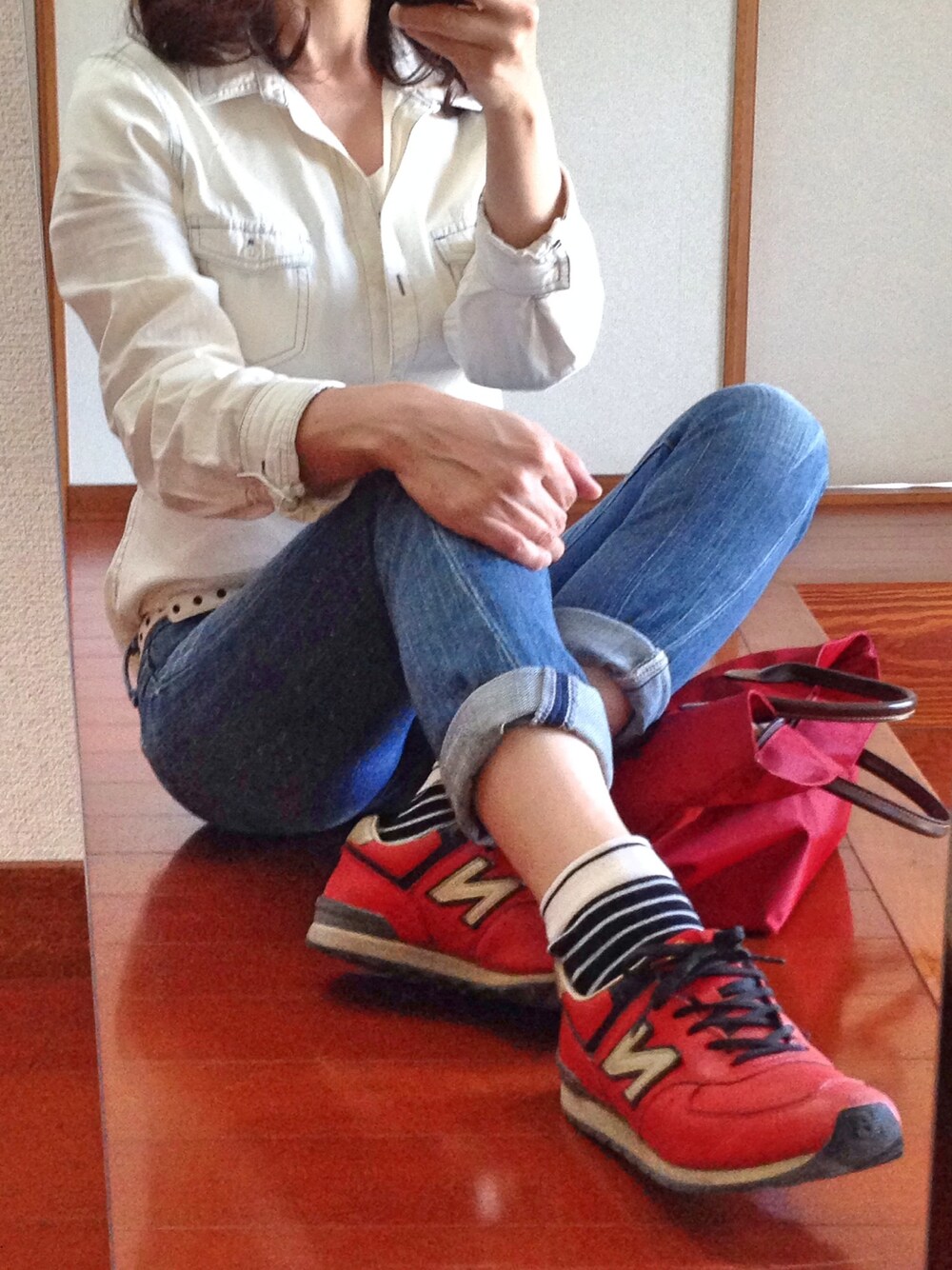 タグがNBって気がついて、シューズ変更☆ 赤のレザーNBは、Pちゃんからのお下がり。 Pちゃん、ありがとー♪ 活躍してるよ〜ヾ(@⌒ー⌒@)ノ 赤のエルベとも仲良し♥️ シャツ OLD NAVY デニム moussy スニーカー New Balance