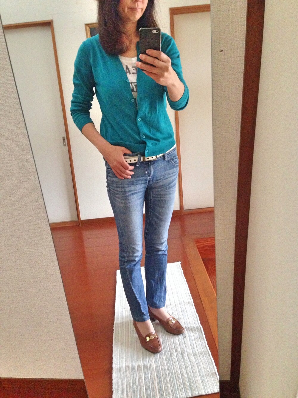 お疲れの金曜日。 気分を上げるビタミンカラー&赤いバック。 カーディガン UNIQLO Tシャツ GU デニム moussy