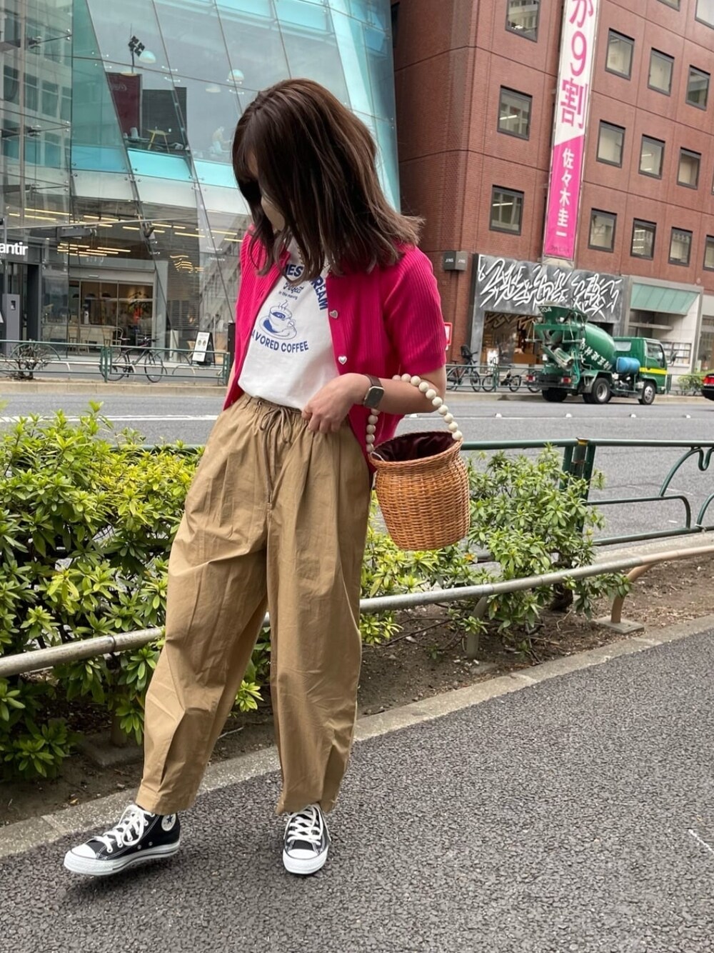 前回同様ミリタリーサーカスパンツを着用 今回はパンツのボリュームを最大限に活かせるようにジャストサイズのトップスであまりダボっと感の出ないコーディネートにしました! アイテムは可愛らしい印象のものを合わせてボーイッシュにならないようにしてみました!