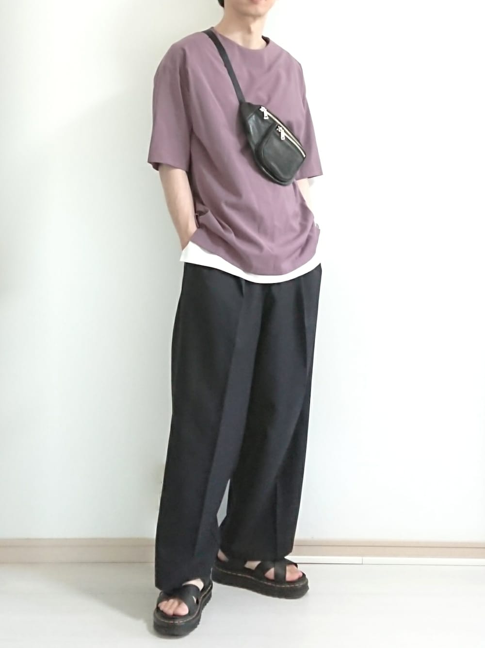 フリフリのスラックス「Action texture tapered wide slacks/アクションテクスチャーテーパードワイドスラックス」を使ったコーディネート