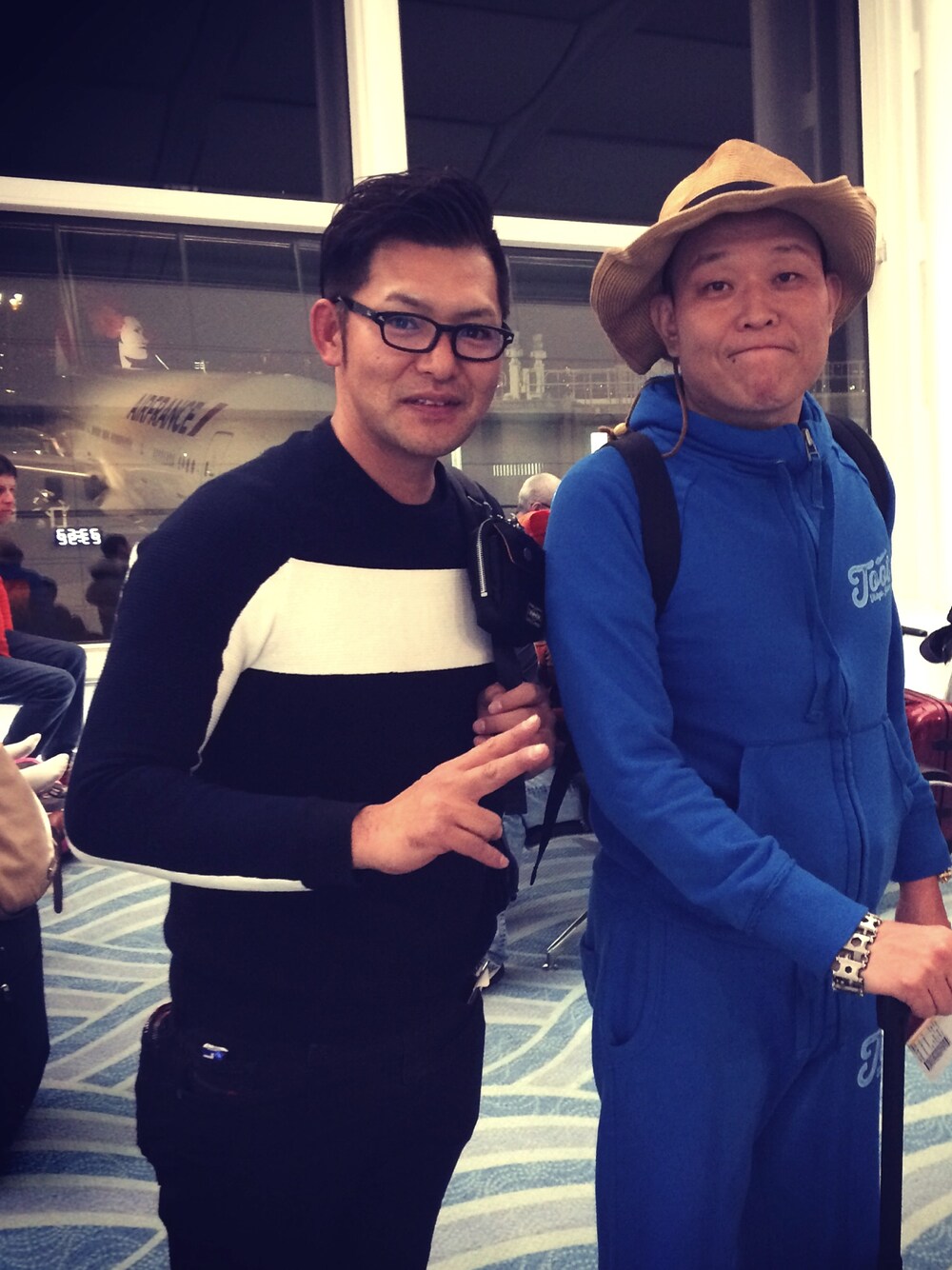 ニットとジョグパンツで フライトで寝る準備… 羽田空港でせいじさんと。