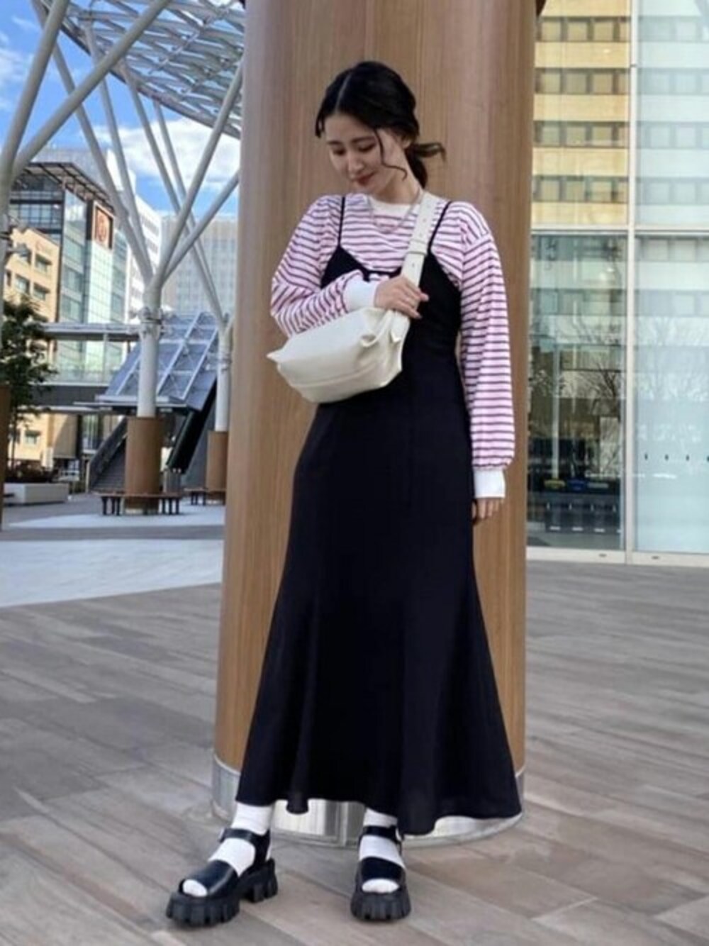 ************************* 身長:164cm/骨格:ウェーブ パーソナルカラー:ブルベ冬/普段サイズ:M ************************* コーデpoint 華やかなキャミワンピをボーダーTシャツとサンダルでカジュアルダウンしたラクチンコーデです。 ・1313140033 ・ビスチェキャミワンピース ・着用サイズ:M ・サイズ感:ゆるすぎるスッキリ着られますが締め付けなく楽に着られます。後ろのアジャスターで長さが調整できるのでどんな身長の方でもおすすめです! ・素材・着心地:サラッとした生地で柔らかく着心地◎ ・1313160015 ・リンガーボーダーロンT ・着用サイズ:FR ・サイズ感:身幅や袖にゆとりがあるが手首のリブで締まるので大きく見えすぎないです。腰くらいの着丈でインしても可愛いです。 ・素材・着心地:コットンで肌触り良くハリのある素材です。首元は少し詰まり気味ですが苦しくなく着られます。 ・1313193006 ・タンクソールシューズ ・着用サイズ:L ・サイズ感:24.5cmですが靴下を合わせても窮屈感ゼロです。 ・素材・着心地:ストラップがあり足にほどよくフィットするのでとても歩きやすいです。