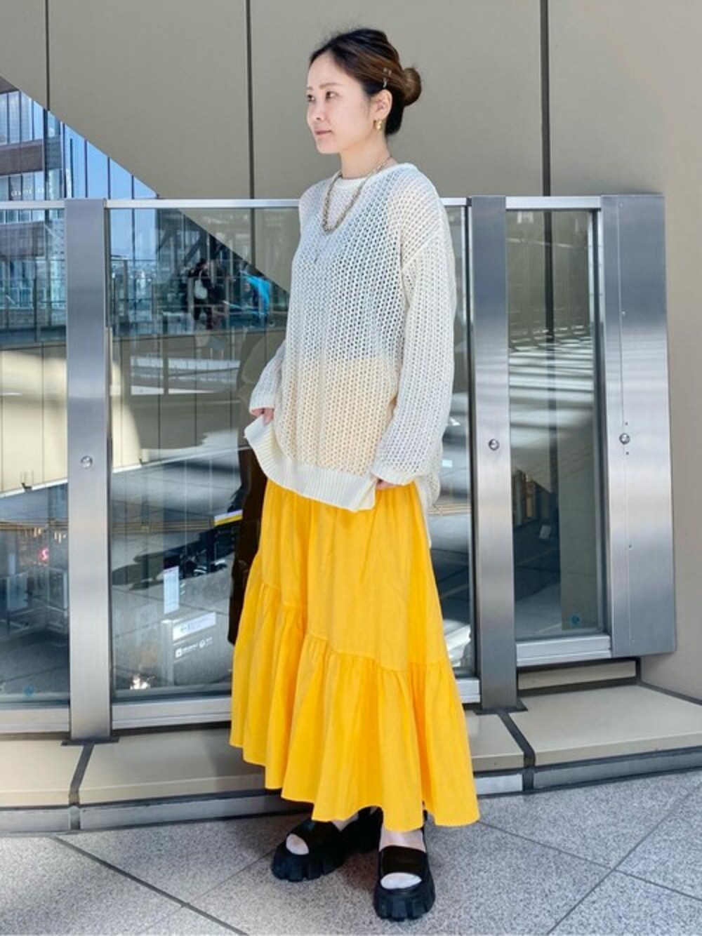 ************************* 身長:166cm/骨格:ウェーブ パーソナルカラー:イエベ春 普段サイズ:M ************************* ・1313170058FR030 ・メッシュチュニックニット【裏地なし】 ・着用サイズ:FR ・サイズ感:かなりゆるっとしたニットです。166cmでヒップが完全に隠れる丈なので、ミニレングスのボトムと合わせても可愛く着られます。 ・素材感:柔らかいタッチのメッシュなので春夏にピッタリ! ・着心地:とっても軽い着心地で、ちくちくしない肌触りが◎ ・1313120013M150 ・ランダムティアードスカート【裏地あり】 ・着用サイズ:M ・サイズ感:166cmで足首までの丈。ボリューム感がほどよくかわいいです◎ ・素材感:コットンでとても軽い素材感です。 ・着心地:バックゴムなのでウエストの締め付け感なく、すっきり着ることができます。 ・1313193006L010 ・タンクソールサンダル ・着用サイズ:L ・サイズ感:24.5〜25.cmを普段履いていますがLサイズで窮屈感などなく履けますよ。 ・素材感:合皮なので雨の日も気兼ねなく履くことができます。 ・着心地:柔らかめのタンクソールで疲れにくく、1日中履いていられますよ。 サイズ別:160cm以上の方にはMをおすすめしています。 コーデPOINT:春らしいメッシュニットをイチオシカラーの黄色でポイントをつけたスタイリングに。