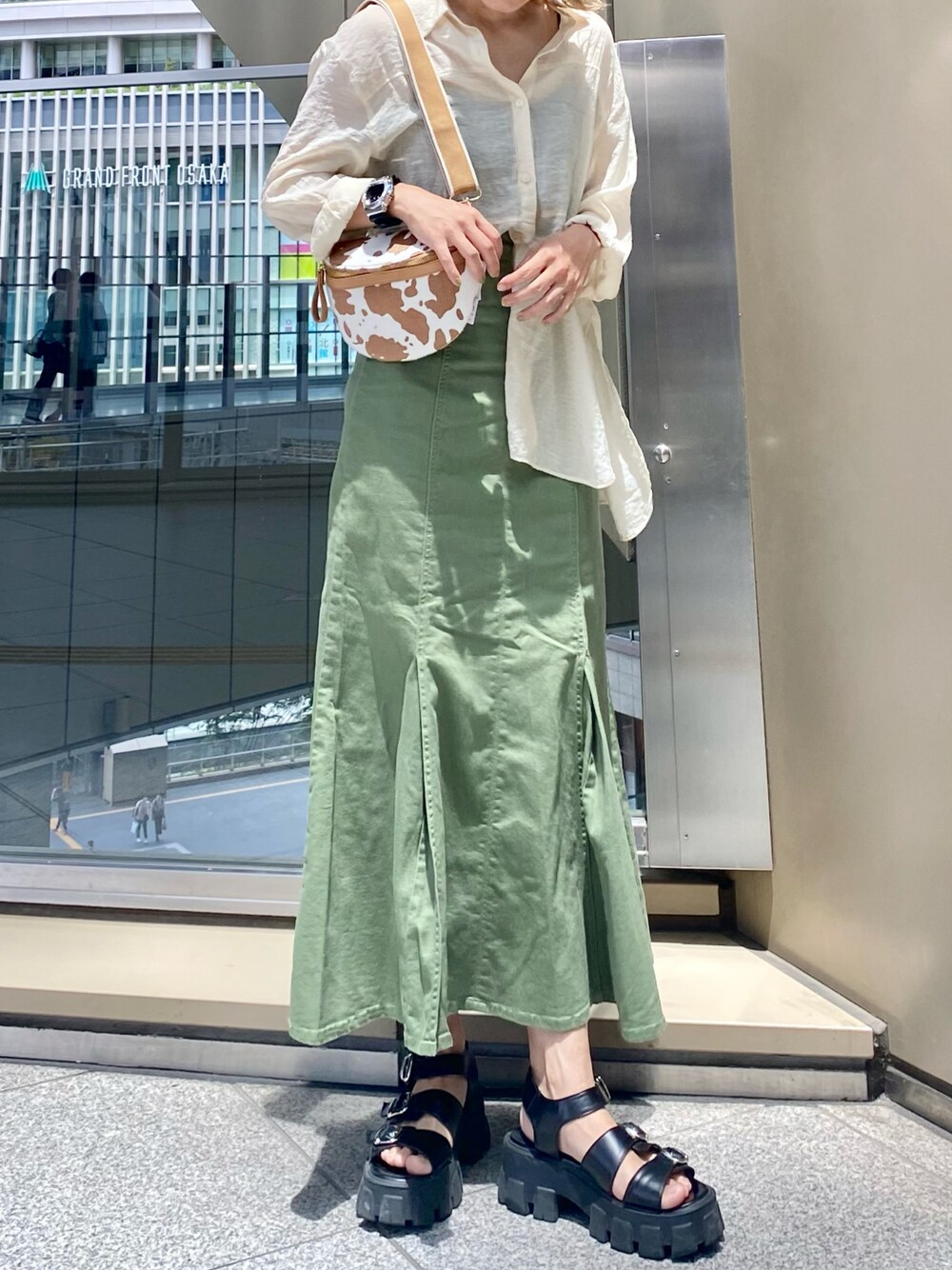 1312110042 シアー切り替えシャツ とっても軽くて盛夏の羽織にぴったりな1枚。 1312120052 ハイウエストタックマーメイドデニムスカート 柔らかいデニムを使用しているため履き心地の良さが抜群。 1312291006 ボディバッグ 秋まで使えるカウ柄バッグはこの時期から抑えておきたい。 1312193006 バックベルトサンダル 厚底のサンダルは足長効果抜群。 *************************** 《スタッフ名:Saya》 年齢:32/身長:166cm/骨格:ウェーブ パーソナルカラー:イエローベース/普段サイズ:M シアー切り替えシャツ 着用サイズ:M サイズ感:ルーズなシルエットでリラックス感持って着ていただけます。 素材感:レーヨンとナイロンなのでとっても涼やかに着ることができます。 着心地:エアリーな着心地でとっても軽いです。 ハイウエストタックマーメイドデニムスカート【裏地なし】 着用サイズ:M サイズ感:ウエスト後ろ部分にゴムが入っているため締め付け感なく、ウエストはハイウエストで着ることができます。 素材感:とっても柔らかいデニムを使用。 着心地:デニム特有の硬い履き心地ではなくとっても伸縮性があるので動きやすいです。 ***************************