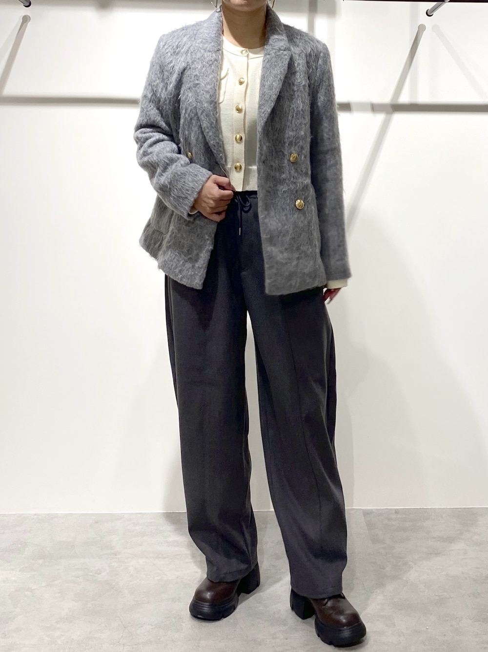 骨格:ウェーブ パーソナルカラー:イエベ 普段サイズ:M ************************* ・ニット(サイズ:FR/カラー:ホワイト) 今年大人気の金ボタンがポイントのニット🧶 コンパクトめのシルエットですっきり着られます! ・パンツ(サイズ:M/カラー:グレー) 少し厚手のあたたかみあるパンツ。バルーンシルエットが今年らしくてかわいい。 長さしっかりとってるので高身長さんも着ていただけますよ◎ ・アウター(サイズ:M/カラー:グレー) 素材感が可愛いコート。 丈長すぎずのコートなので、シャギー素材ですが着膨れせず着られます⭐️