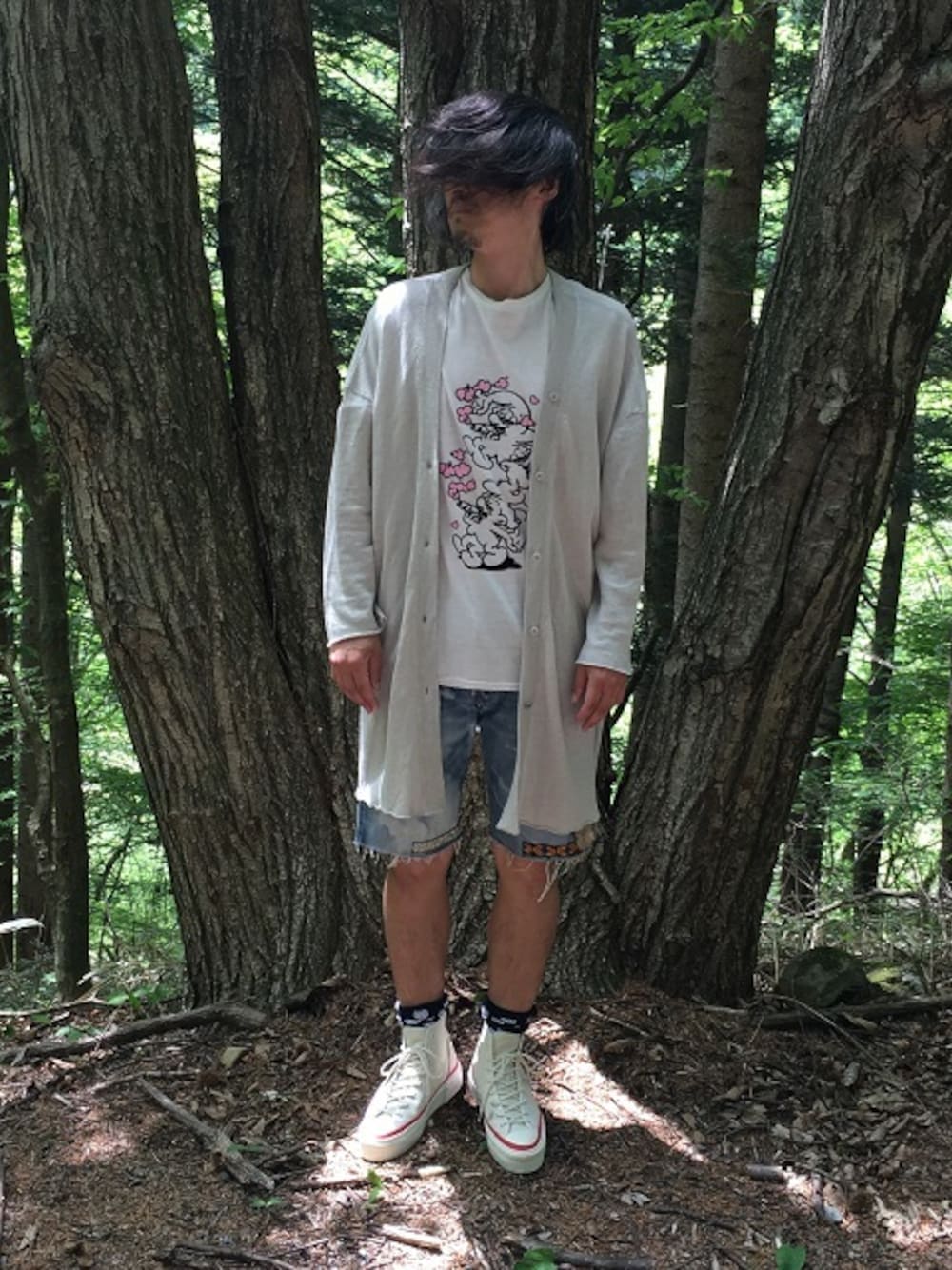 今日はお休みなフリースタイル 1時間前からいい雨が降っています 2週間前に山で撮ってきたシリーズに突入です この日は山でもけっこう暑かったです stofのリネンカーディガン JUVENILEのTシャツ giletのリメイクデニムショーツ 淡い色のコーディネート さらっとリネンの羽織り、おススメです さらっとどうぞ~