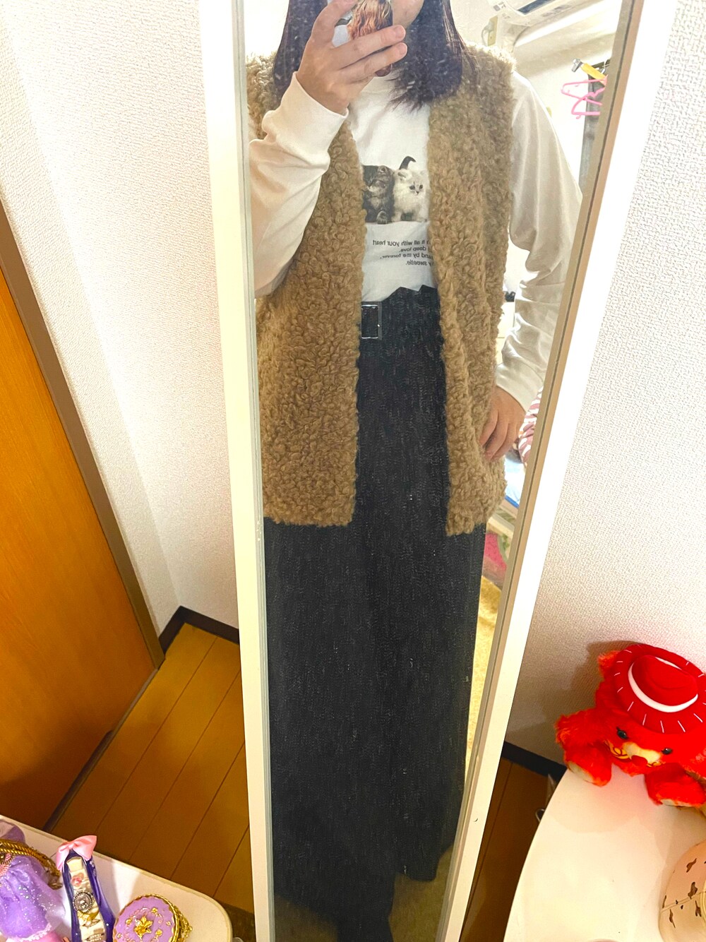 秋のカジュアルスタイル!!✨️ 今日はどうしてもボアベストを 合わせたかったからちょっと カジュアルめにしたけどボトムスを 黒のワイドパンツにしたから ちょっと大人っぽく(◍ ´꒳` ◍)👍 treatのネコちゃんトップス グラフィックな絵になってるから 可愛いっ⸜(*ˊᗜˋ*)⸝💕