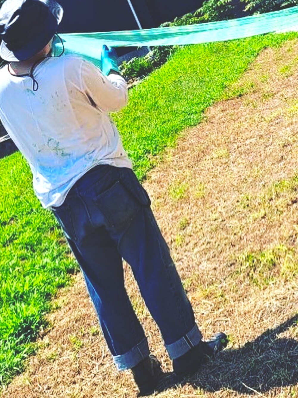 藍染めして遊びました☺︎ 偶々着てた白ロンTにもふざけていっぱい藍で落書きしました。デニムはBIG E、 ブーツはHENRY。