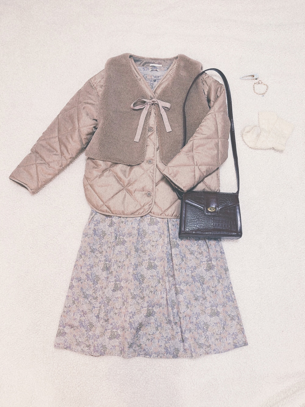由莉のノーカラージャケット「ボアベスト付キルトジャケット」を使ったコーディネート