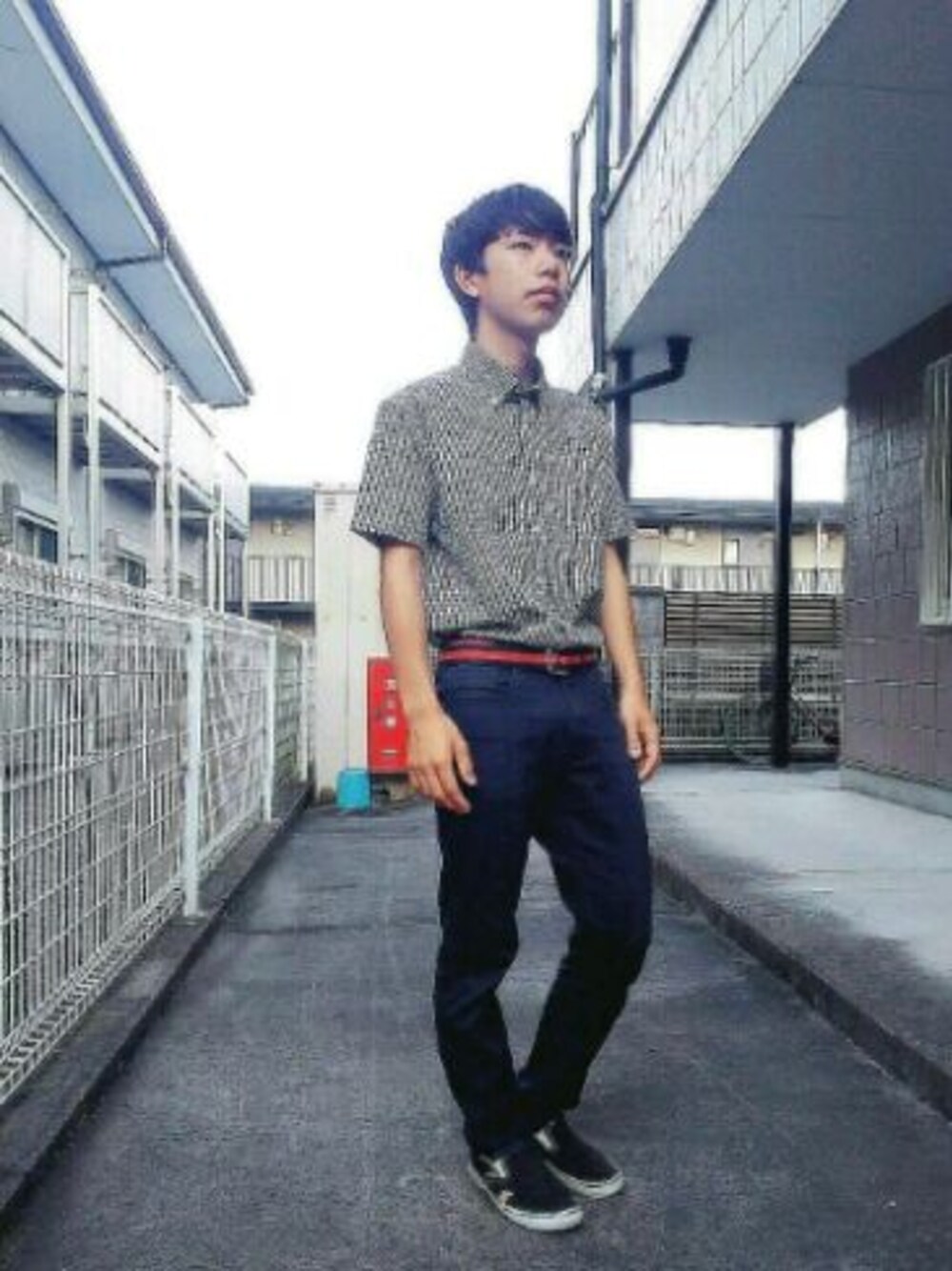 半袖のギンガムチェックシャツをタックインして、きれいめな雰囲気を出してみました。足元はスケシューでハズしのポイントにしました。