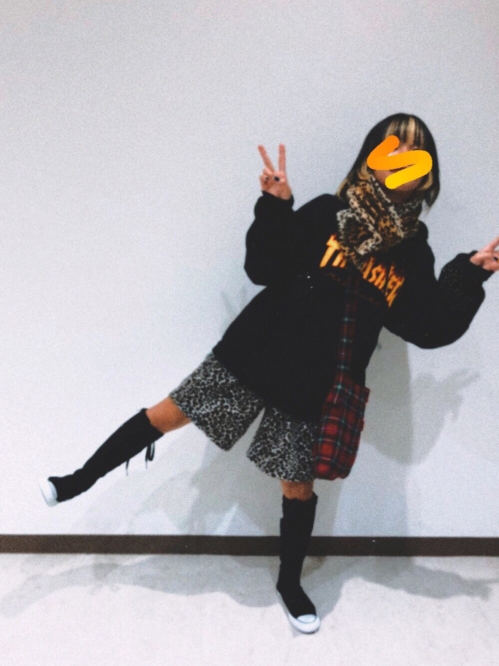 ヒョウ柄のハーフパンツは手作り チェック柄バッグはスカートをリメイクしたもの マフラーは古着やさんです。
