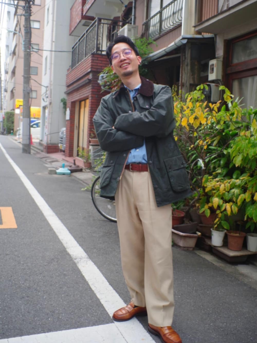 BarbourにきれいめなボトムスとAURALEEのサックスブルーのシャツを合わせたコーデ