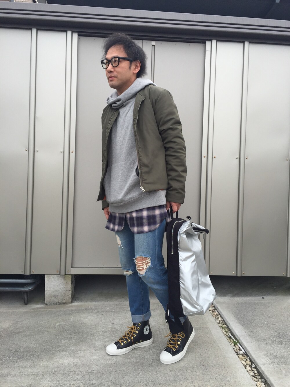 御覧頂きありがとうございます MA-1祭りに参加させて頂きます*\(^o^)/* 最近ヘビロテのパーカーにノーカラーのMA-1 アクセントにチェックのシャツを入れました コンバースのハイカットは初売りで安くなって いたので 思わず買ってしまいました( ^ω^ ) いいね セーブ フォロー頂けると嬉しいです