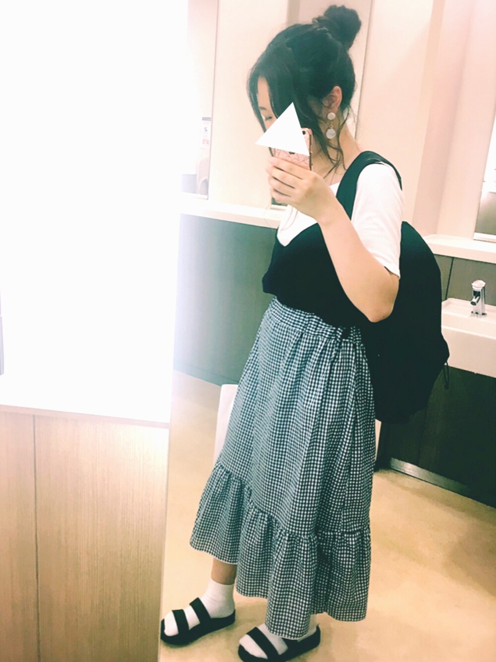前と変わらん😅 DHOLICのスカートは形もギンガムチェックの大きさもドンピシャ👏🏻 無印良品のサンダル歩きやすいしプチプラやし良い買い物した💜