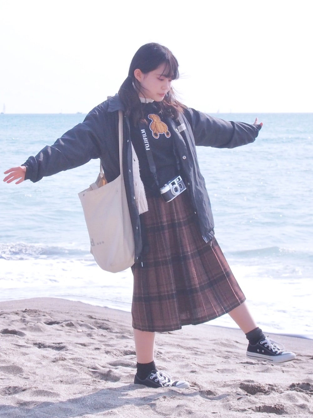 鎌倉行きました。 謎ポーズ笑 ゆるい古着ちっくな服装が相変わらず好きです。チェック柄も好きです。くまさんも好きです。 くまさんのTシャツは憧れの方から貰いました。 スカートは高円寺で買った古着です。