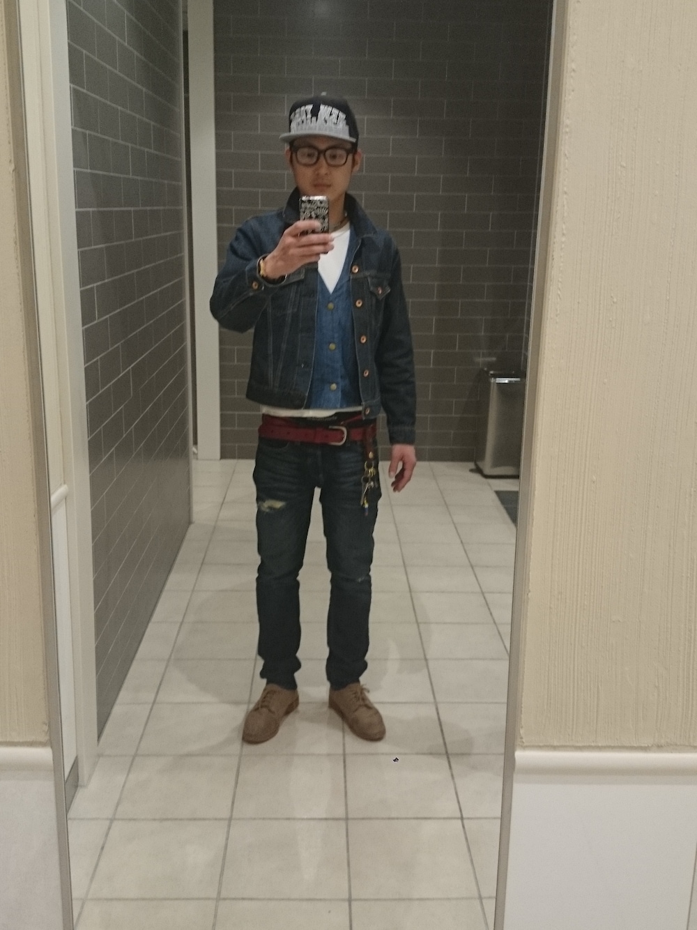 デニムオンデニムにさらにデニムのベスト着用✴ イオン岡山のトイレで撮ったので誰か来ないかヒヤヒヤw