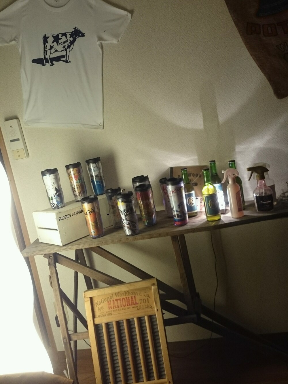 またまたまた更新www 今度はインテリア🎵 木製のアイロン台にウッドボックス置いて スタバのご当地タンプラー置いてます🎵 あと高知行った時に買った地ビール。 ビール飲めないから開けずに置いてますww アイロン台の下には洗濯板置いてる。 古着屋が作ったTシャツと麻袋飾って この空間お気に入りです🎵