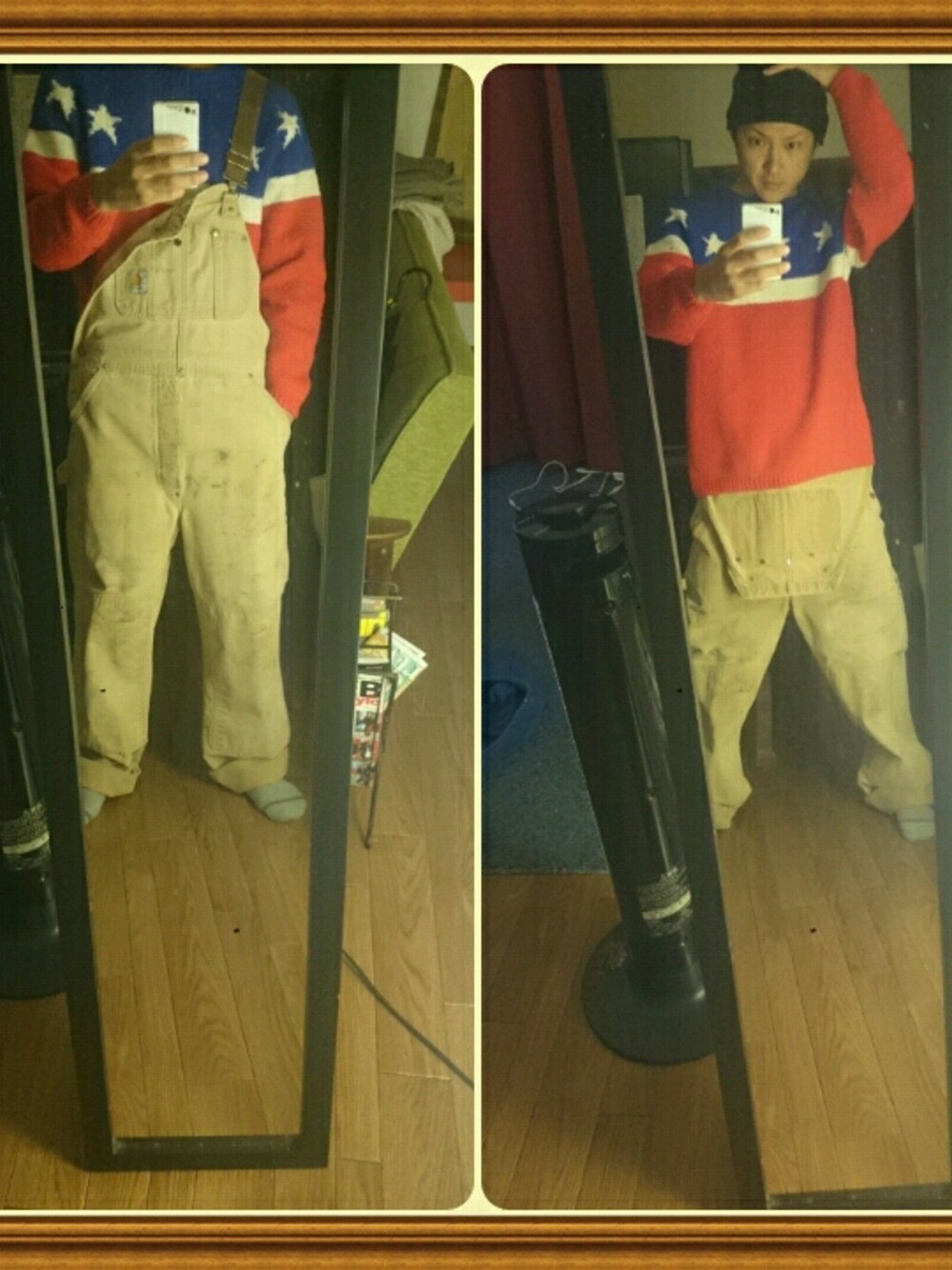 今日のコーデ オーバーオールとニットで🎵 オーバーオールの汚れがカッコいい🎵 気に入ってます☺