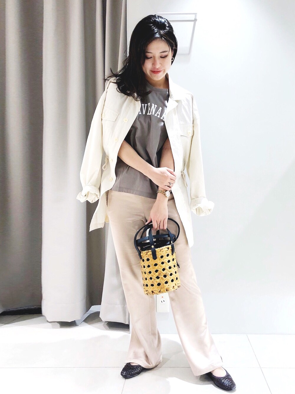 今年らしいニュアンスカラーコーデです♪小物に締色やリラックス感のあるアイテムを使うと甘くなりすぎずに使えます♪
