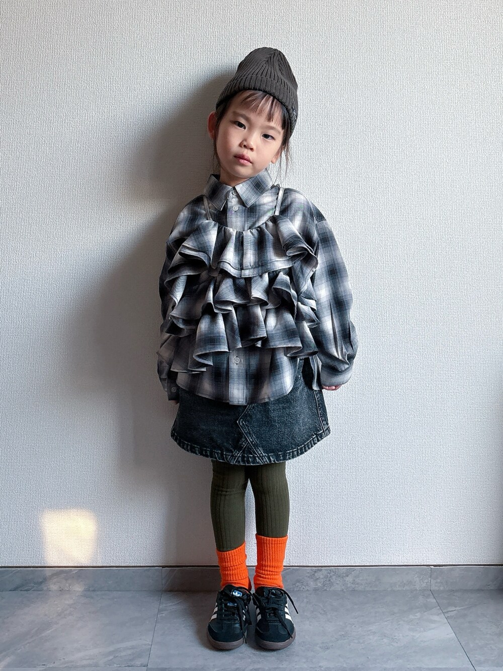 めちゃくちゃやりたかった チェックキャミ×チェックシャツ🖤🩶🤍 タイツの色もいい感じ💚