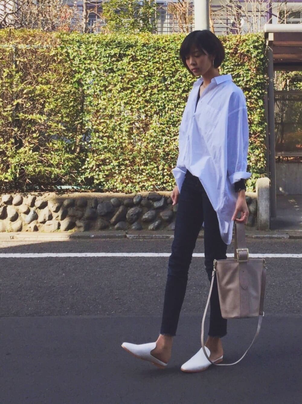 ユニクロ出勤の日なので、上下ユニクロ🌿 オーバーサイズロングシャツは今限定価格なのでオススメ🙆🏻❤️❤️ 足元はお気に入り、GUのバブーシュ😊👠
