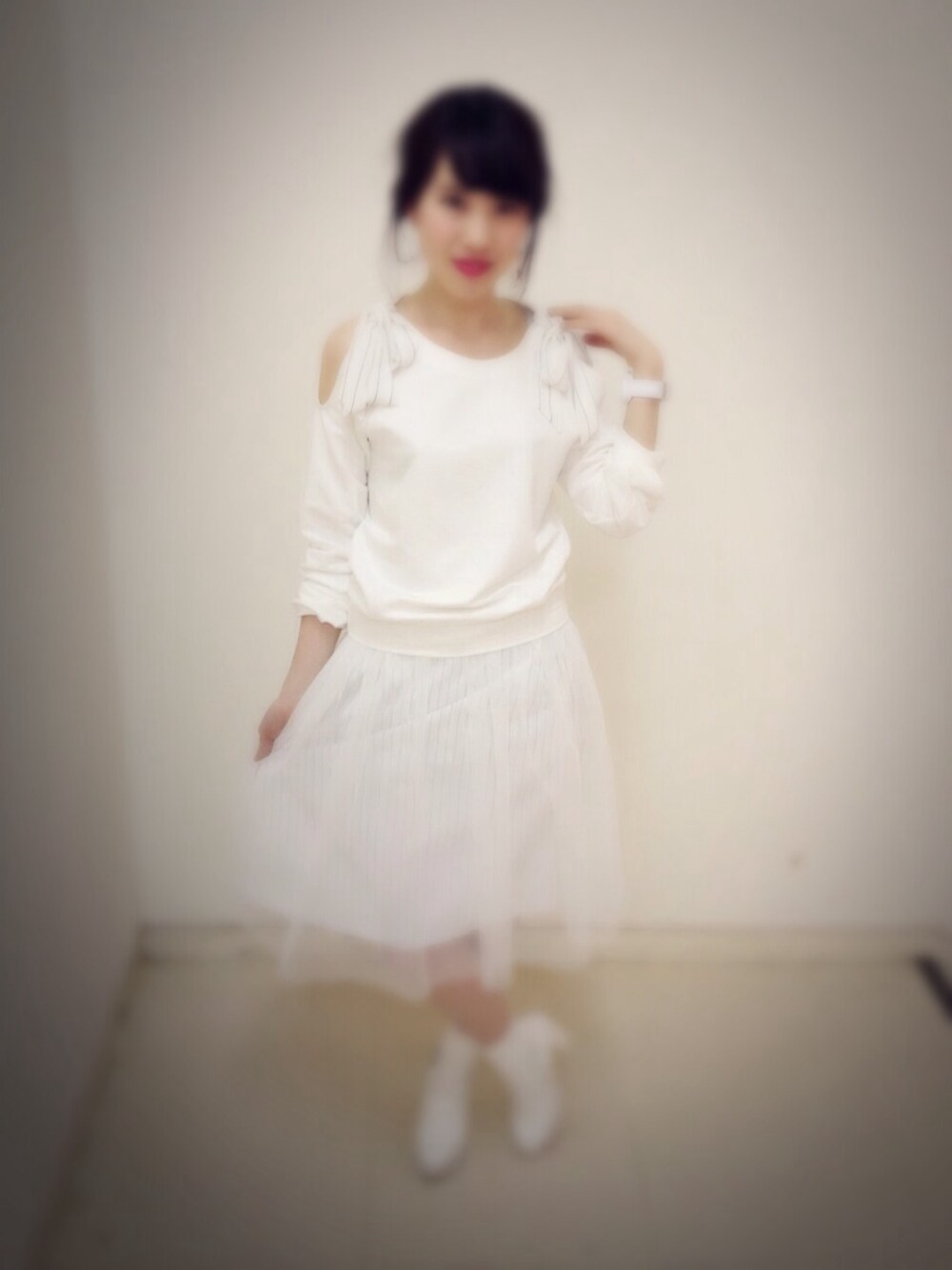 TOPSのリボンのストライプとチュールSKのストライプがセットアップぽい♡ 最近オールWhiteにはまってます♡