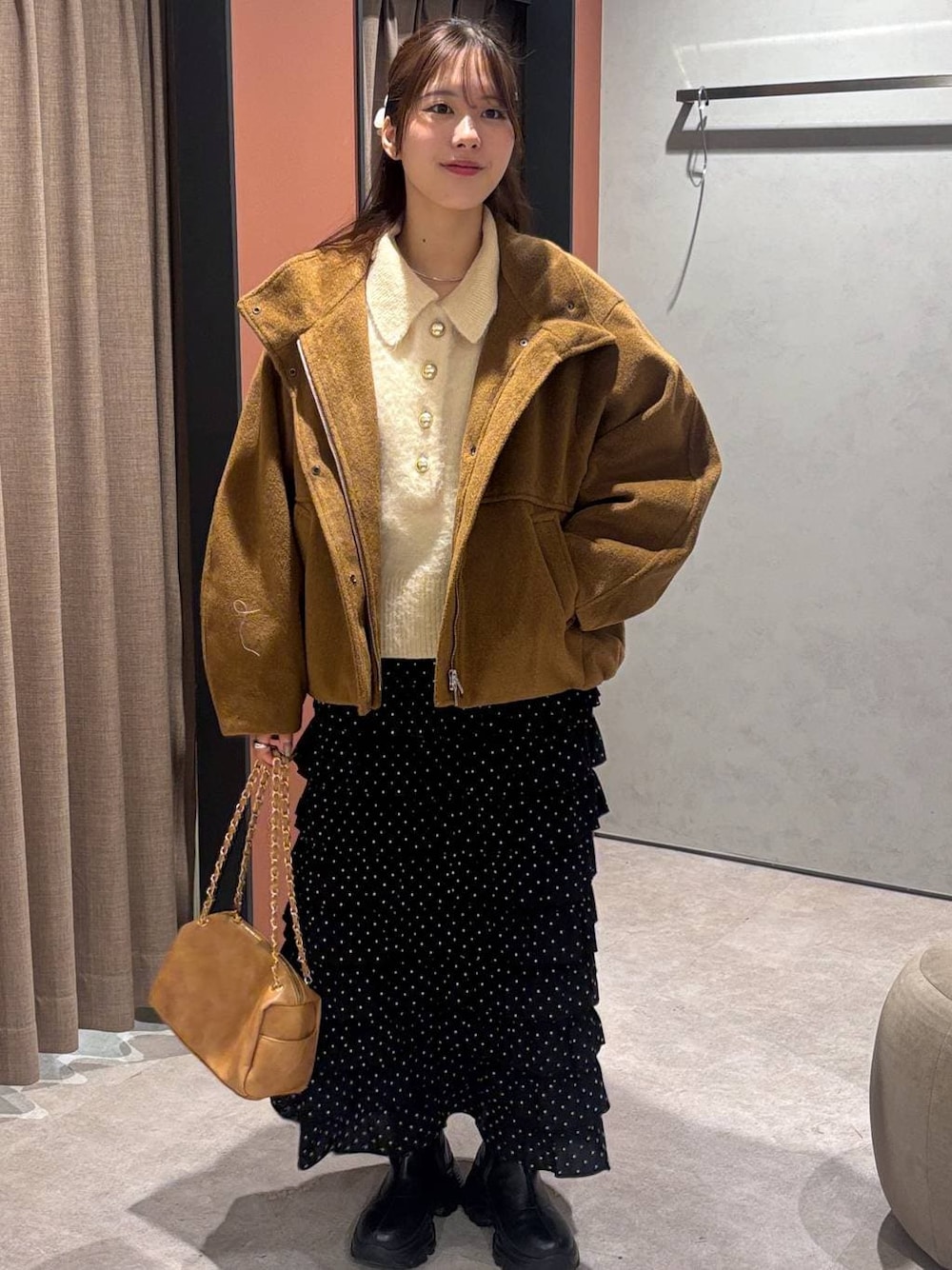 ✔きれいめカジュアルコーデ ブラウンのアウターを最近リアルバイしました⭐️ おしり周りの部分がくしゅっとなってるのもポイント♡ 見た目以上に軽くて暖かいのでおすすめです!!