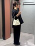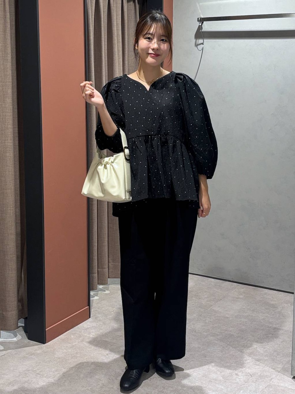 ✔セレモニーコーデ 深めのVネックが首元をスッキリさせて、抜け感を出してくれます❕ ボリューム感があるアイテムですが、ボトムスをスッキリさせれば🙆🏻♀️ 今っぽいドット柄でさり気ないアクセントにしています