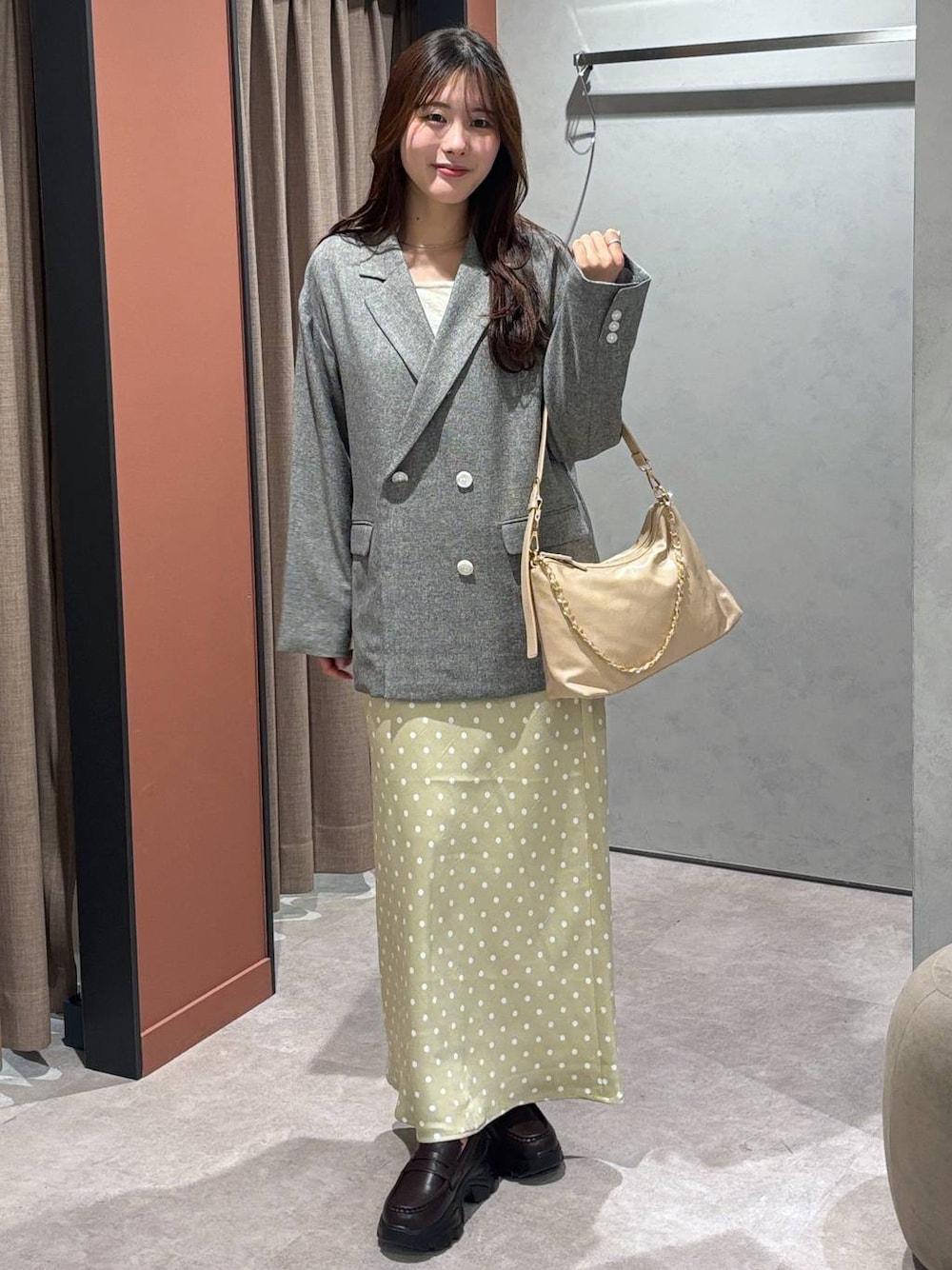 ✔大人フェミニン🤍 大好きなジャケットでコーデを組みました♡ ポイントはドットスカートです❕ 〇トップス ゆったりめな大きさで、おしり周りが隠れる丈感です 中に厚着をしてもそこまでごわごわしないです! 〇ボトムス 大大大人気のサテンスカートに新色が🤍✨️ 可愛すぎる、、 春らしいベージュカラーです🫶🏻