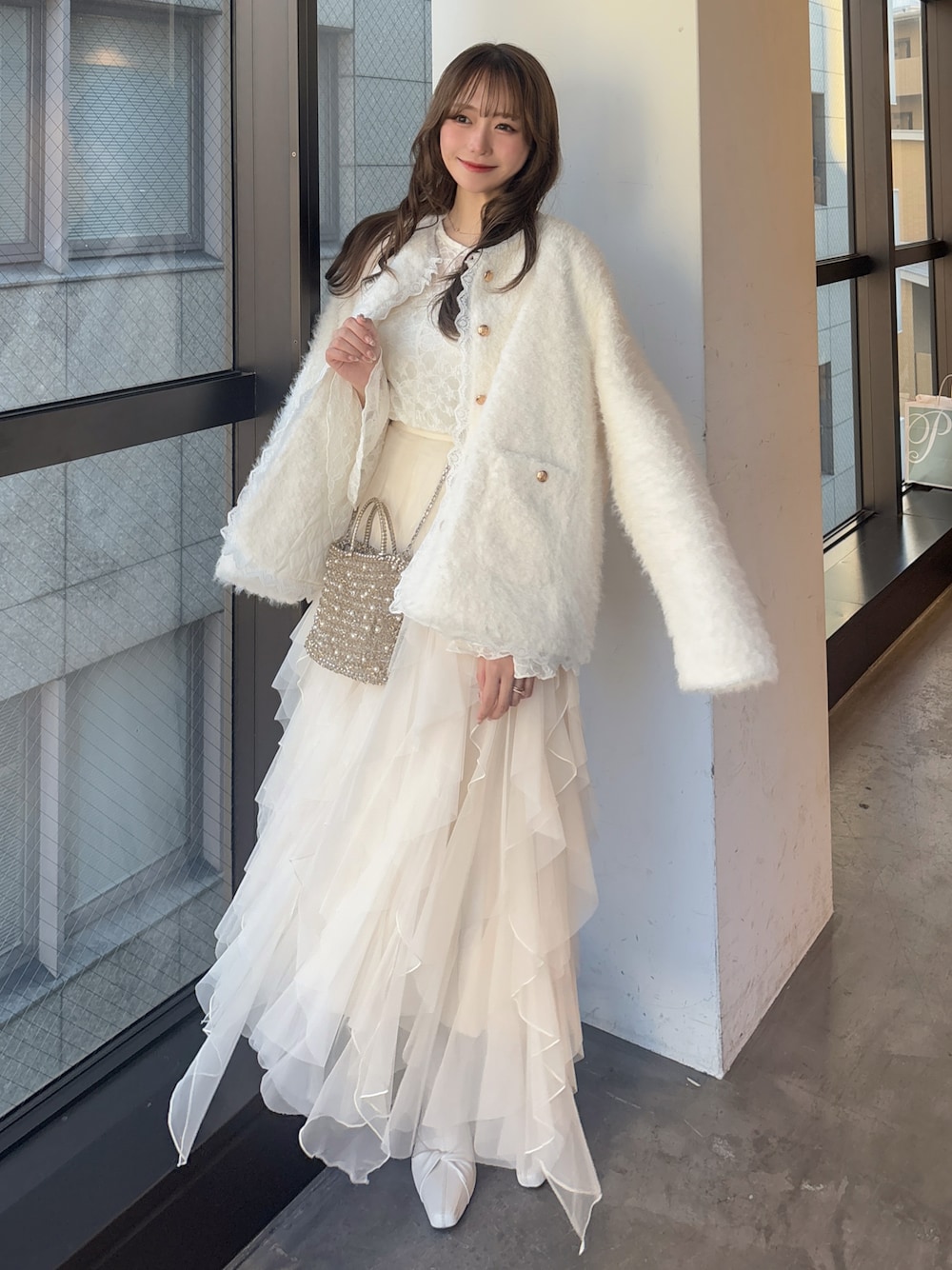白濱楓雅🐚 fuchan_2003のノーカラージャケット「暖かいシャギーレース切り替え金釦ノーカラージャケット」を使ったコーディネート