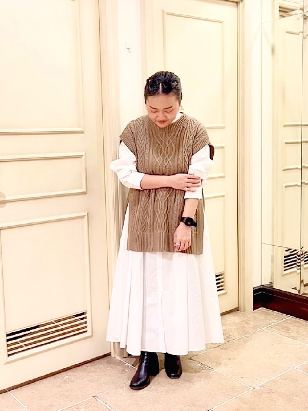 ご覧頂きありがとうございます🍂 ケーブルニットベストとシャツワンピースのレイヤードコーデです☺️ シャツワンピースの下には、デニムを履いています! ベーシックなシャツワンピースも、ベストを重ねると今年らしくなりますね☺️✨