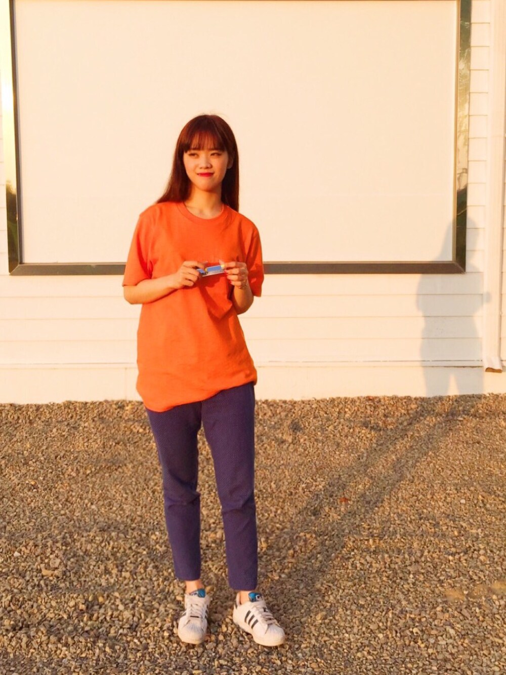 オレンジ系のTシャツ/カットソー、ホワイト系のスニーカーを着用したレディースの夏コーディネートの1枚目の写真